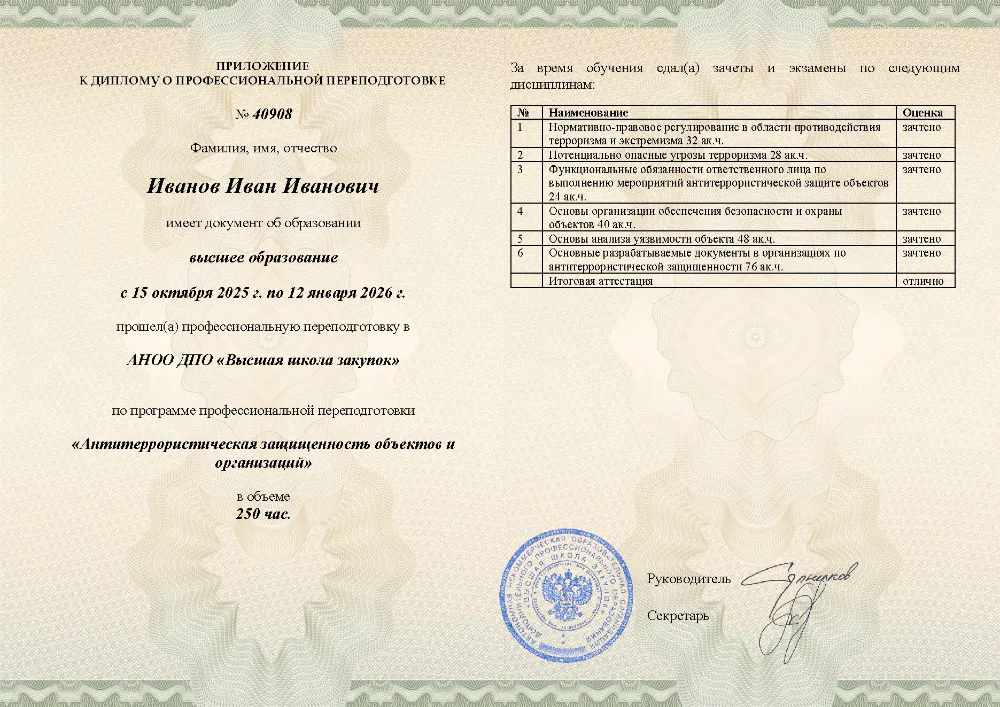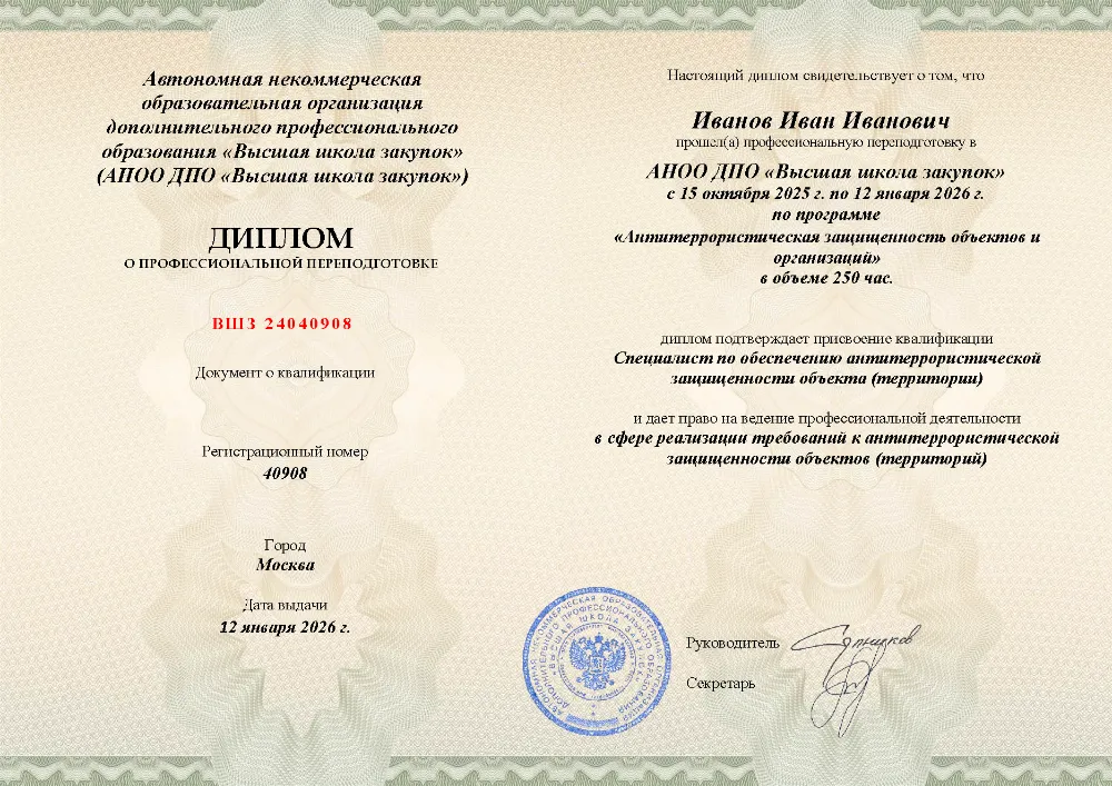 Повышение квалификации, 72 академических часов, 7 модулей: нормативно-правовые основы противодействия терроризму, анализ угроз и рисков, функциональные обязанности ответственных, инженерно-техническая укрепленность, документооборот и действия персонала при ЧС. Онлайн-обучение в в Костроме с итоговой аттестацией.