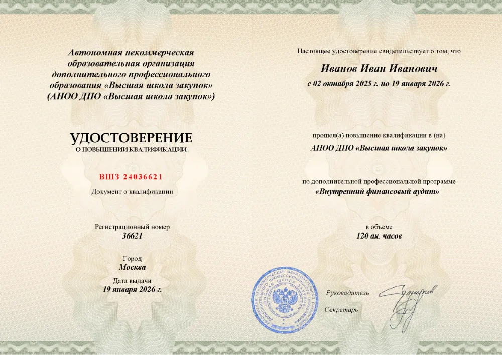 Повышение квалификации, 120 академических часов, 8 модулей: правовое регулирование и основы внутреннего финансового аудита, планирование и методика аудиторской проверки, выявление нецелевого использования средств и реализация результатов аудита. Онлайн-обучение в в Костроме с итоговой аттестацией.