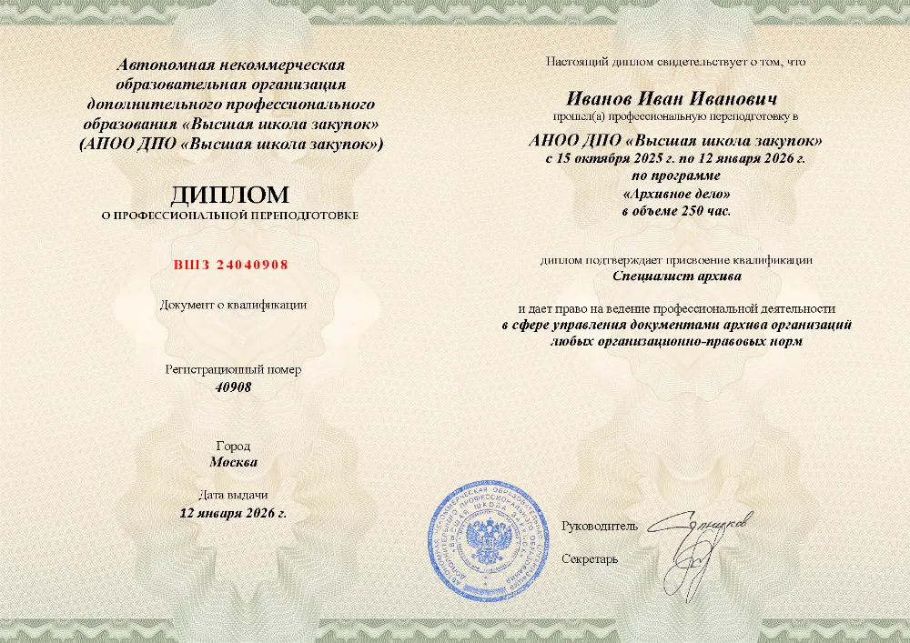 Программа профессиональной переподготовки (500 часов) для специалистов по документоведению и архивному делу. Полный курс от нормативно-правовых основ до современных технологий: экспертиза ценности документов, обеспечение их сохранности, создание поисковых систем и работа с документами по личному составу. Онлайн-обучение в в Костроме с итоговой аттестацией.