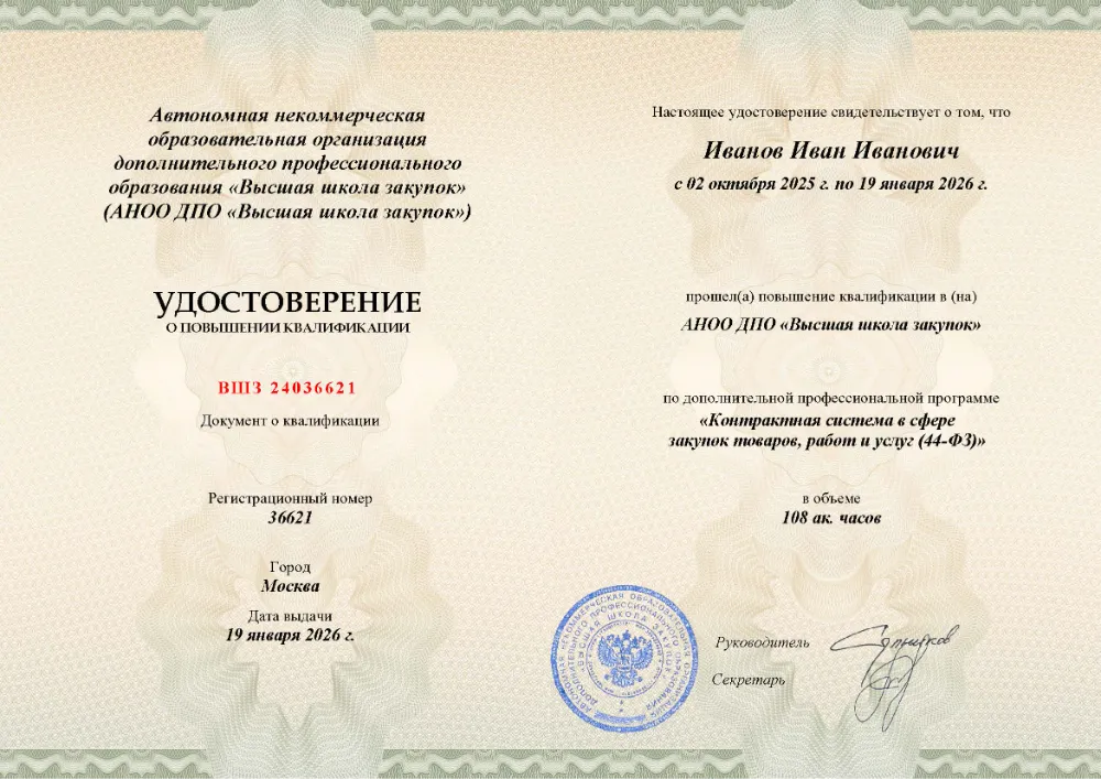 Повышение квалификации, 108 академических часов, 4 модуля: общие положения, принципы и планирование закупок по 44-ФЗ, процедура закупки у единственного поставщика, заключение, исполнение, расторжение и банковское сопровождение государственного контракта. Онлайн-обучение в в Костроме с итоговой аттестацией.
